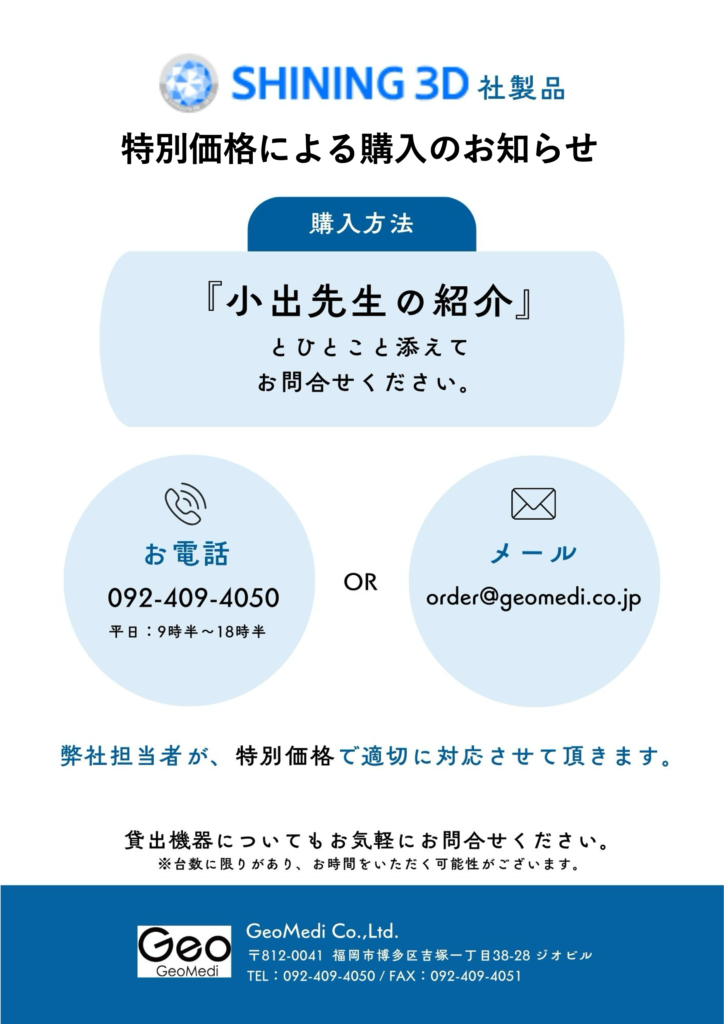 | 1 | SHINING3D社機器のご紹介 NEW | SHINING3D社機器のご紹介 NEW | SHINING3D社機器の特別価格による購入について | ▶︎ | ▶︎ |