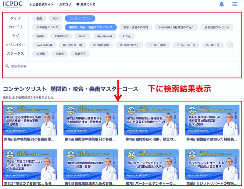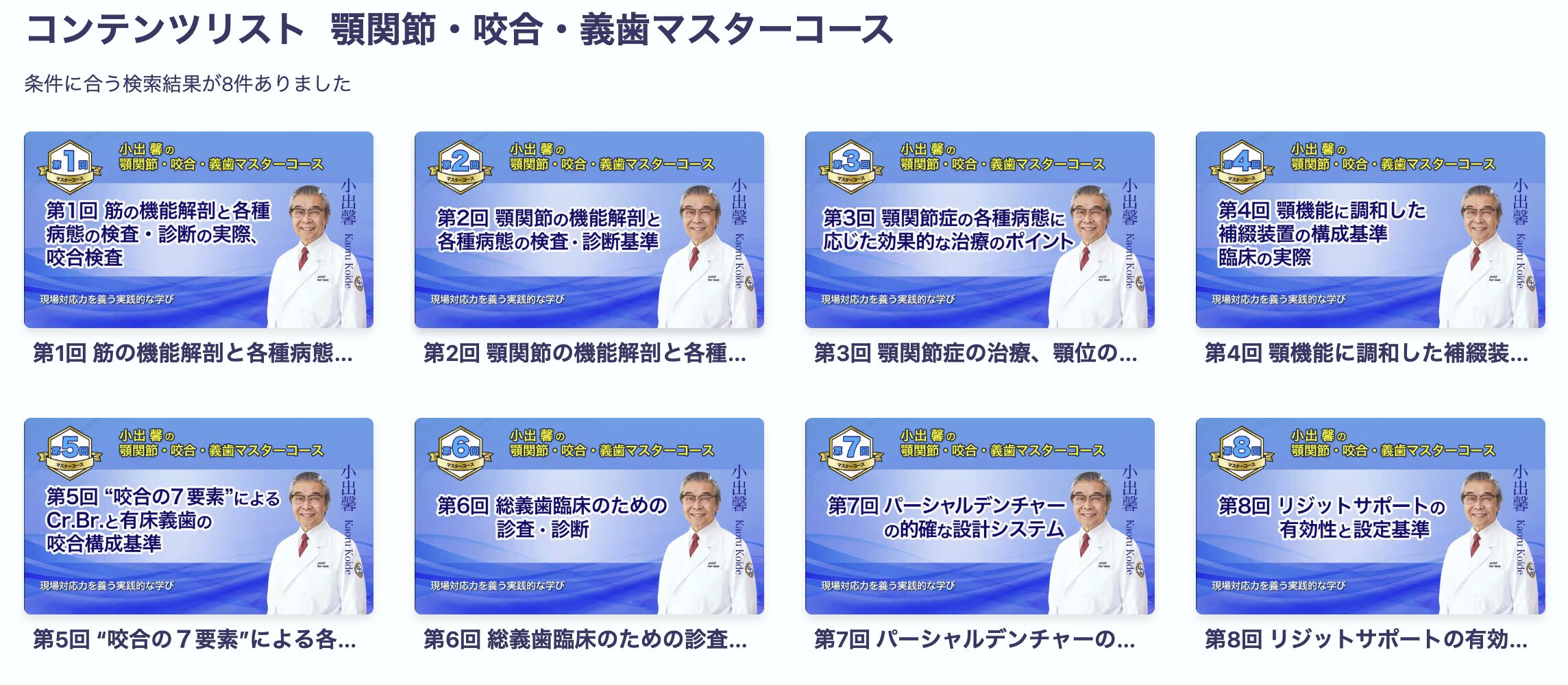 TOP画面最下部に表示されている「商品から探す」に表示されているコースを選ぶ「小出馨の顎関節・咬合・義歯マスターコース」は全8回から構成されています。全8回コース(第1回〜第8回)、前半5回コース(第1回〜第5回)、後半3回コース(第6回〜第8回)とありますのでご興味に合わせてお選びください。